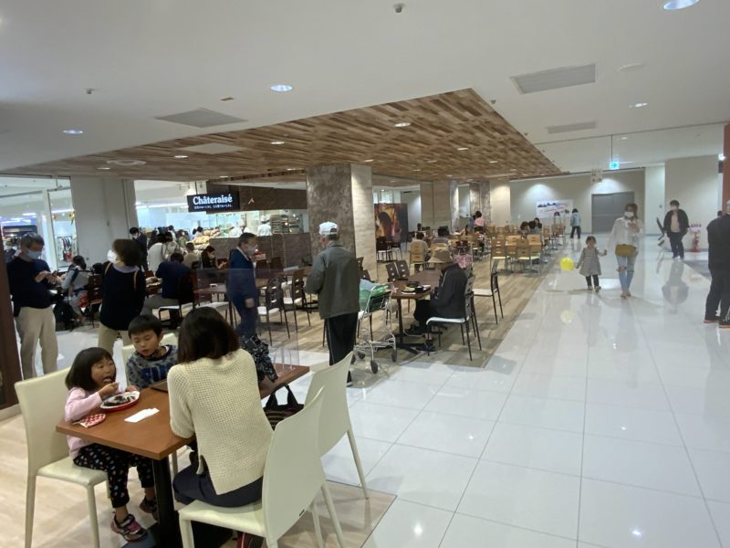 フードコートもひろびろとしていて、テーブルとテーブルの間隔も広く、仕切板も用意されているので、安心して利用できます。