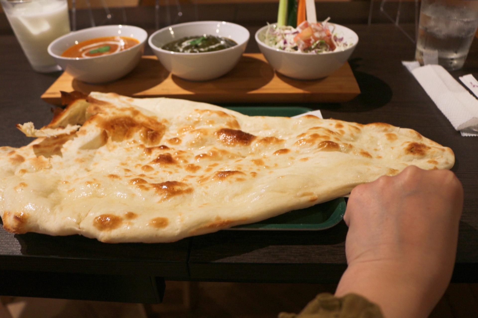 ナンが大きい‼︎私の拳と比べてもほら。はるかに大きい。めちゃくちゃ大きい。全部食べられるのか不安になっていると、残ったらお持ち帰りも出来るそう。