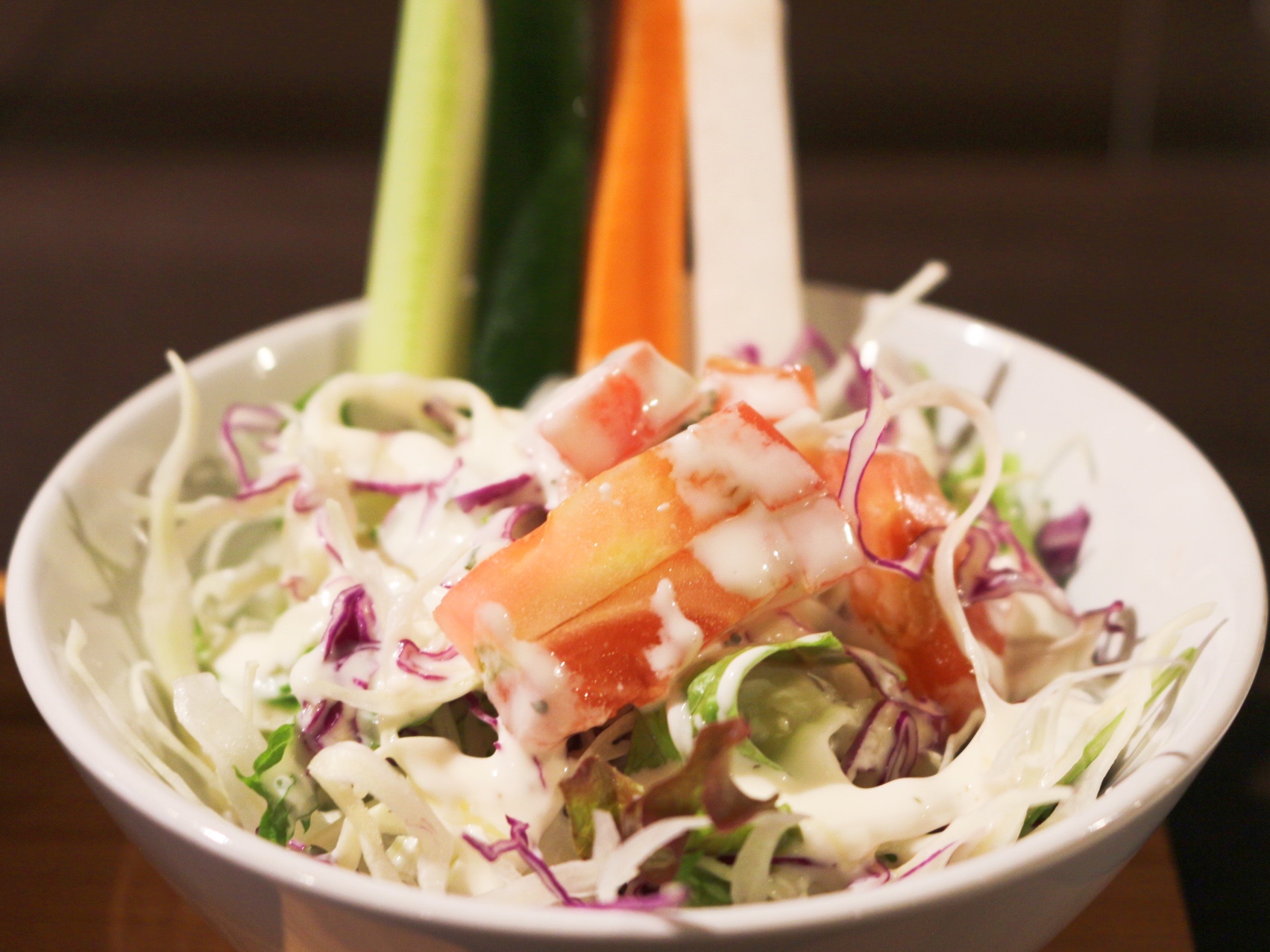 セットに付いているサラダには、ヨーグルトみたいなドレッシングが掛かっています。とてもまろやかな味でした。