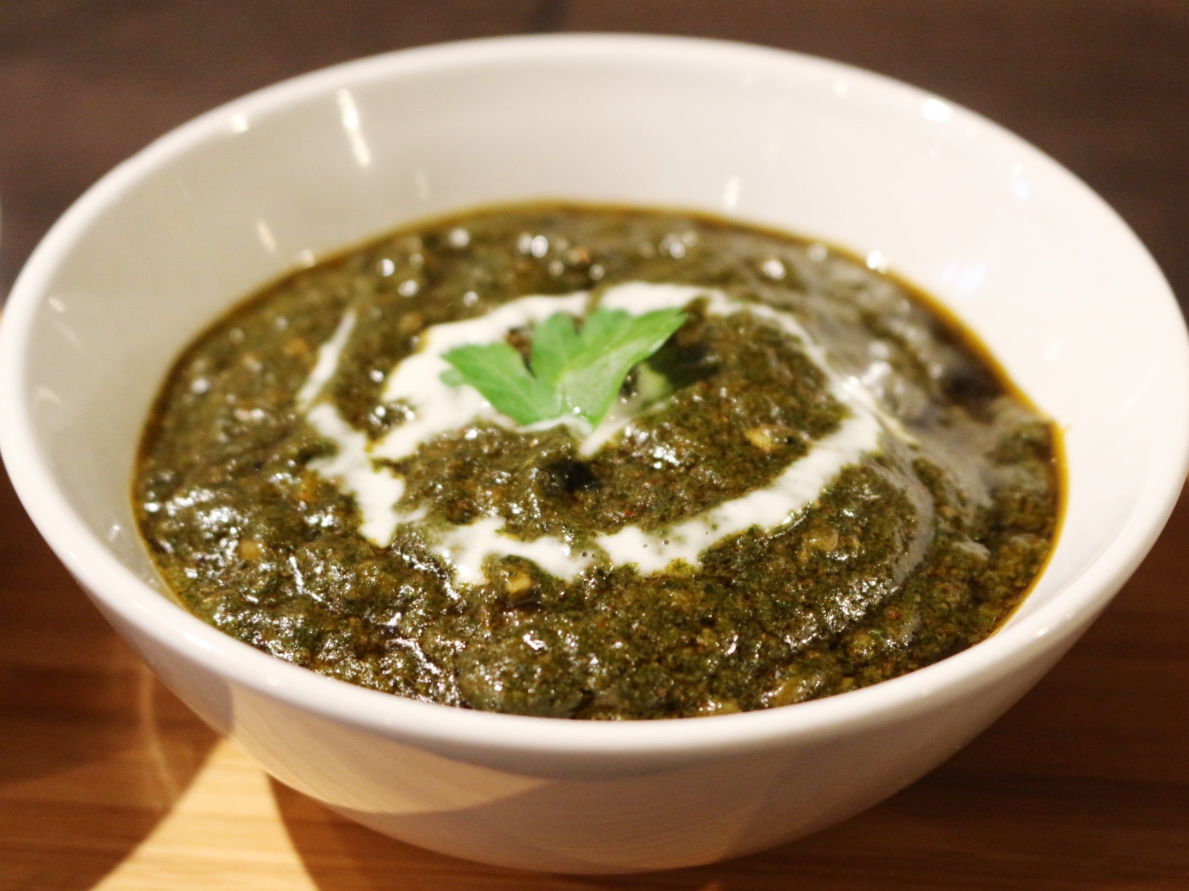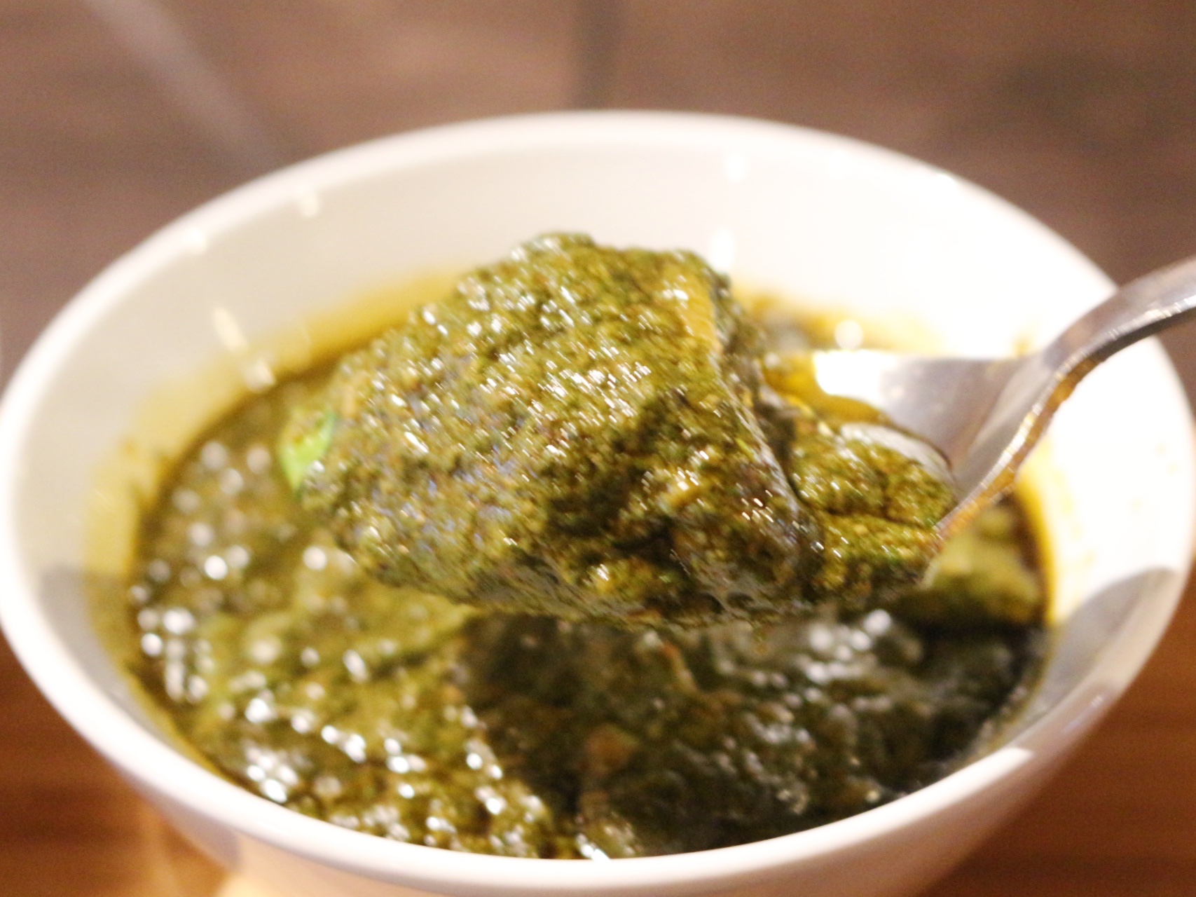たっぷり入ったほうれん草がペースト状になっているカレーです。こちらも辛めにしてもらいましたが、ややまろやかな口当たり。口に入れた途端、ほうれん草の風味がぶわっと押し寄せています。美味しい!