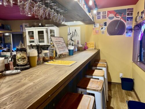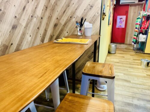 ちょっと腰掛ける感じがラフに立ち寄れる立ち飲み屋風です。