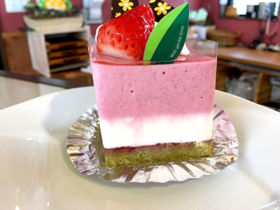 レアチーズと木いちごのムースの綺麗な二層で、その下には和風に餡と抹茶の層もあります。