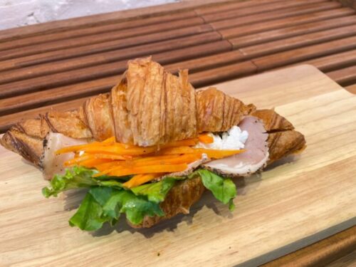 クロワッサンサンドは、クロワッサンにパストラミやフレッシュな野菜をたっぷりサンドした、豪華なサンドイッチ!バターがたっぷり入ったふわっと軽い食感のクロワッサンに、旨味のあるパストラミ、そしてシャキシャキ感のある厚切りのキャロットラペがアクセントになっていて、これまた絶品!