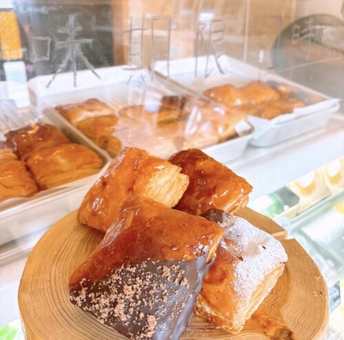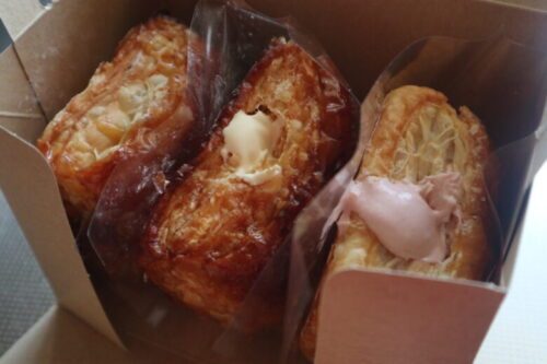 パイぬれいちご練乳(410円)パイぬれチョコ(410円)パイぬれミルク(380円)。あとは週替わりのパイが1種類出来るそうです。(お値段は令和5年7月現在のもの)