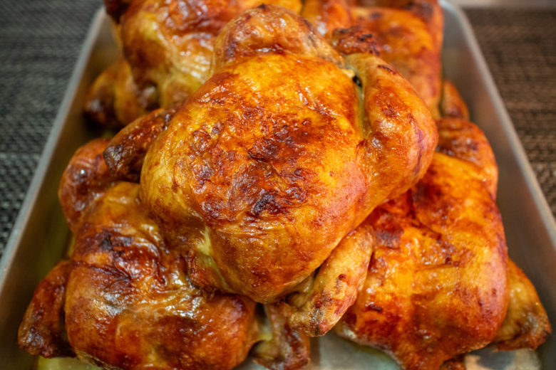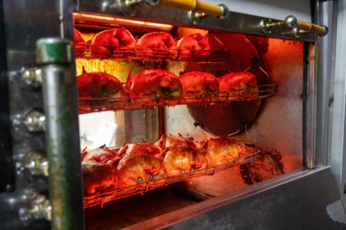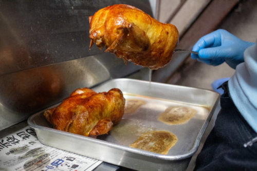 4日間醤油ベースの秘伝のタレに漬け込んだ丸鶏を、回転式ロースターで1時間以上かけてじっくり焼きあげます。