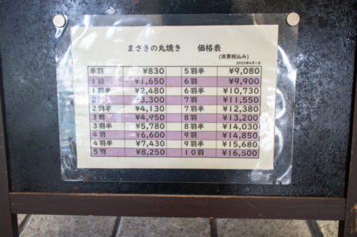 まさきの丸焼きは半羽から購入することができ、1羽丸ごと買っても1650円。