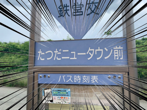 まさかの「たつだニュータウン前」。ついに漢字の世界を飛び出し、ひらがなまでも登場しました。