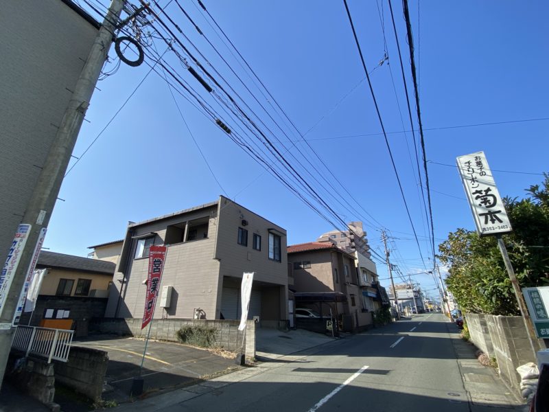 熊本市中央区の八王寺通り。国府高校のそばです。片側1車線ですが、交通量は多い道路沿いに「営業中」ののぼりが。