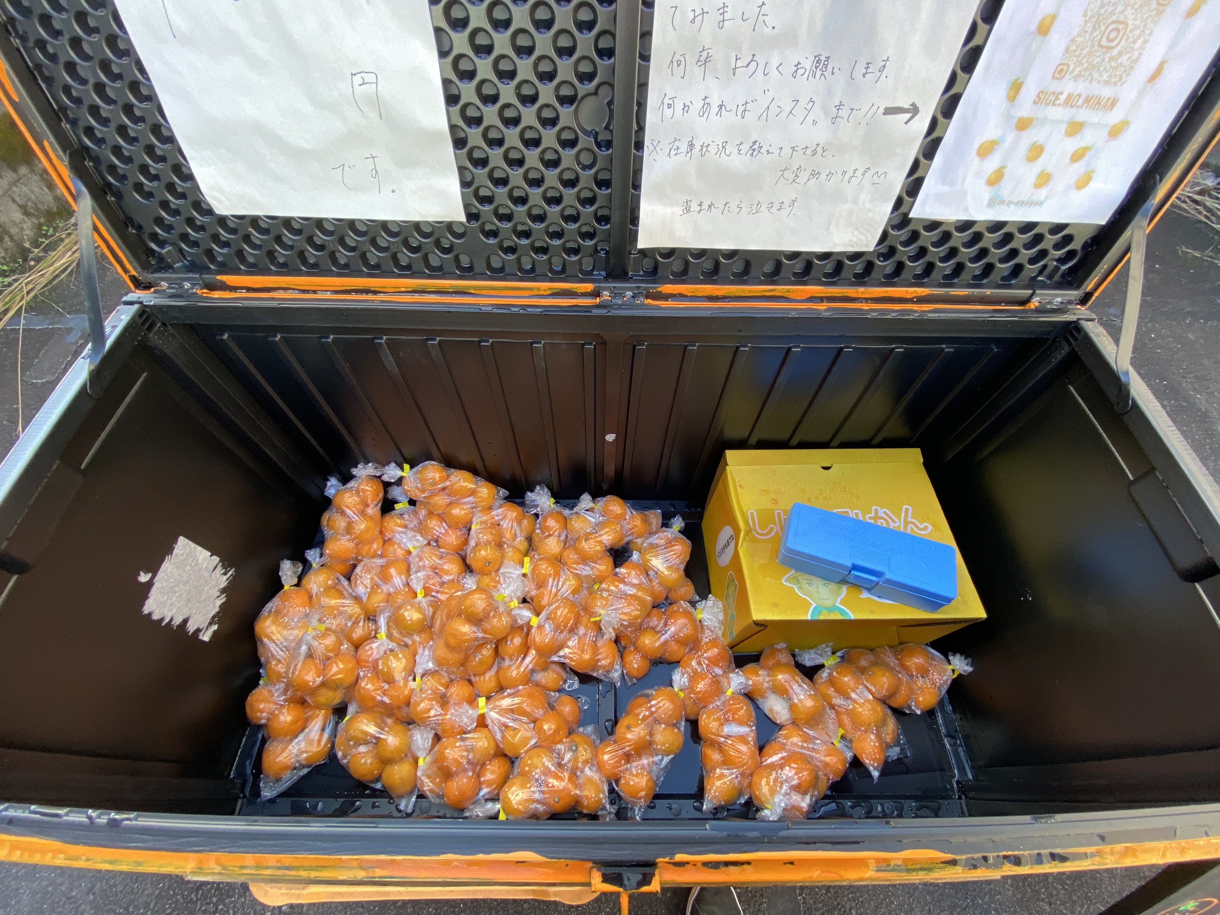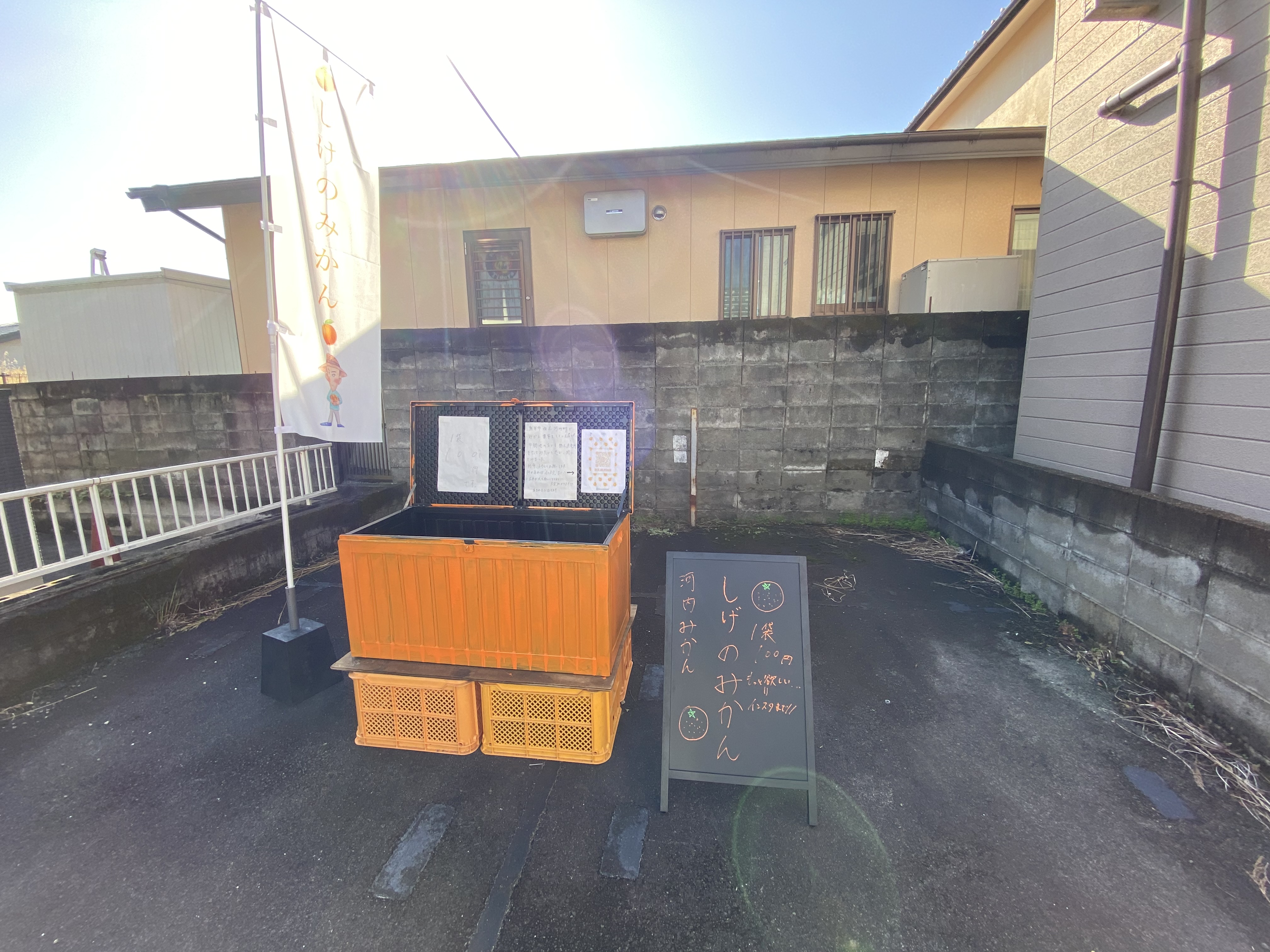 ミカン箱の上にミカン色の箱。ちょっとのぞき込むのが怖い箱ですが、横の看板に「みかん一袋100円」と書いてあるのでミカンが入っている事でしょう。