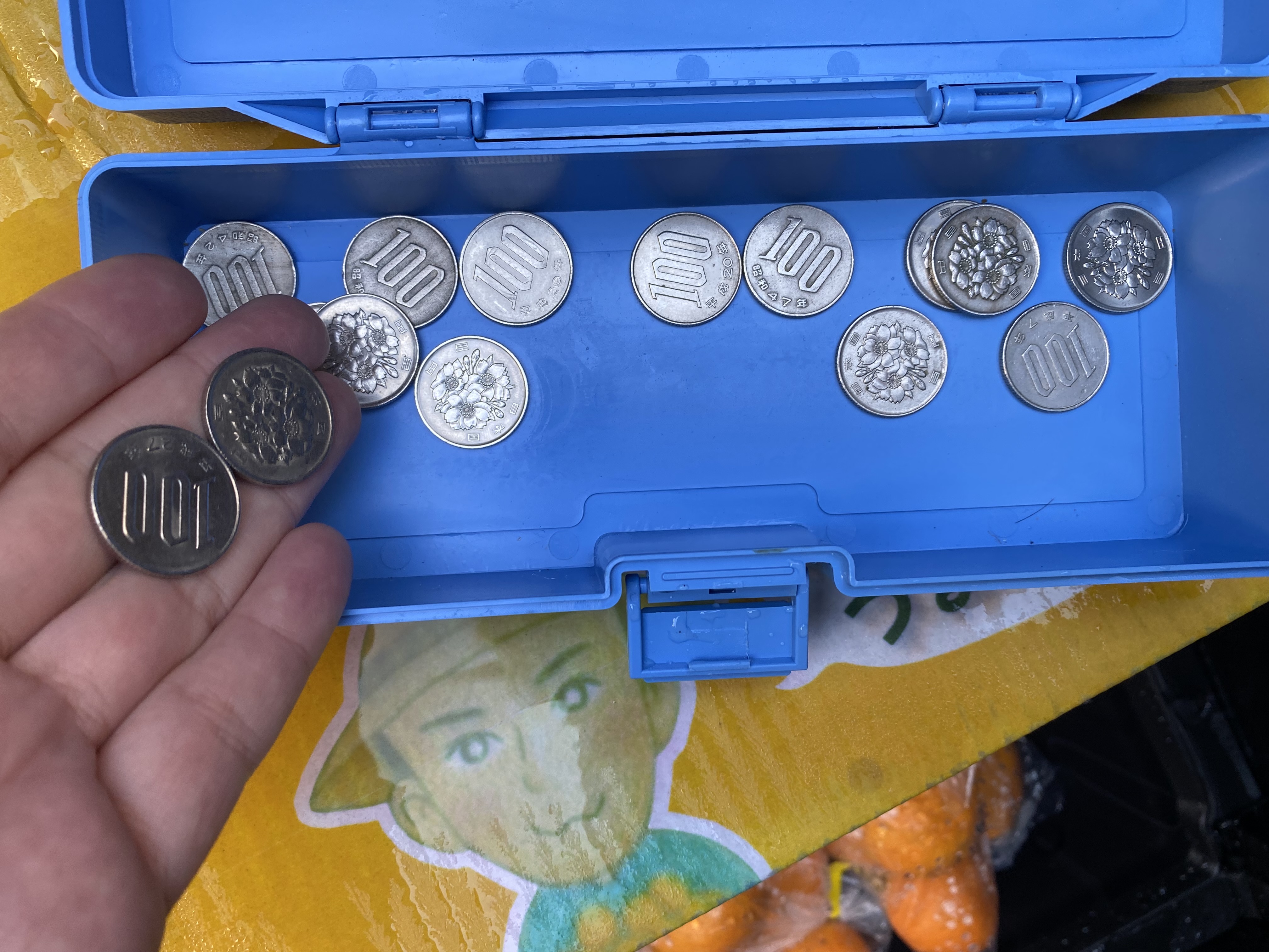 青い箱にお金をいれて。