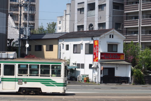 お店の入り口を開けば、すぐそこを熊本の路面電車が走っています。