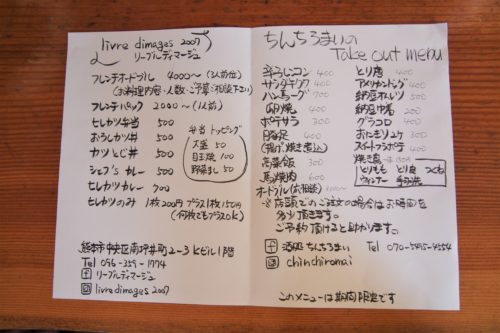 テイクアウト商品のメニュー表、左側には「リーブルディマージュ」の文字。
