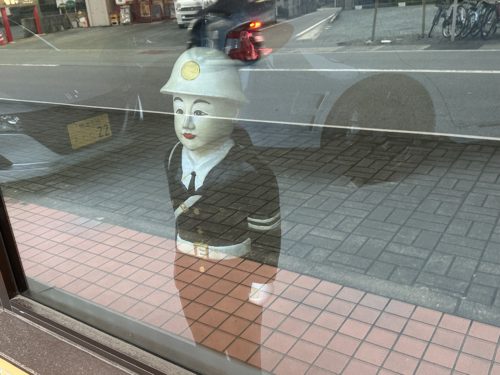 北区にある中古車屋さんの窓ガラスに警察官の置物があり、いつもこっちを見ています。