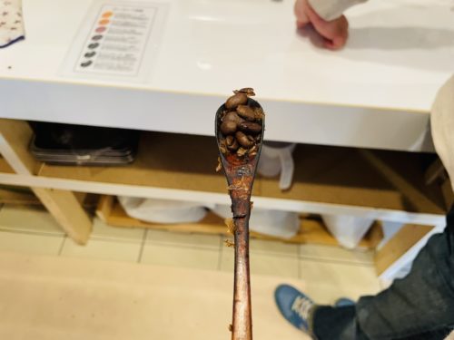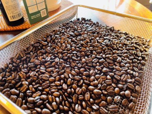 山田さんから、「これが一回目、豆がぱちぱち言い出した時です」と焙煎機の中から出して見せていただきました。初めて見ました。こんな間近焙煎。今都会の方では浅煎りが流行っているそうですが、私はもう少し、田舎住みでありますから、もっと焙煎を続けてもらいました。