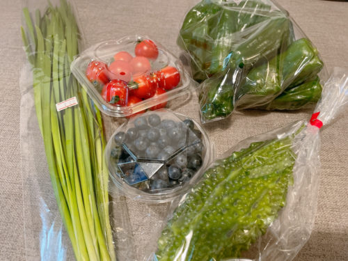 ちなみにこのニラ・ゴーヤ・ピーマン山盛り・ミニトマト・ブルーベリーを買って総額434円でした。
