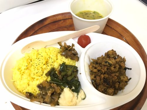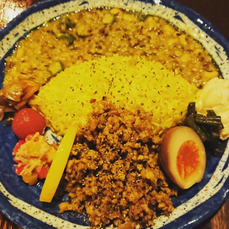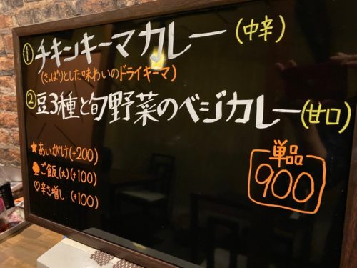 メニューは大体1ヶ月程度で、オーナーの気分によって変えられているそうで、この日は、チキンキーマカレーと豆3種と旬野菜のベジカレーの2種類でした。