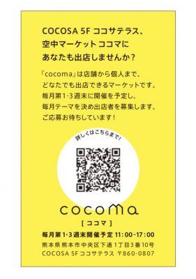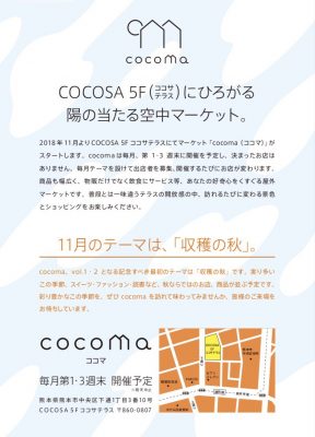 2017年4月に下通りダイエー跡にオープンし、多くの買い物客でにぎわうCOCOSA。そんな話題のCOCOSAのテラスで、11月から初の空中マーケット「cocoma」がスタートします。