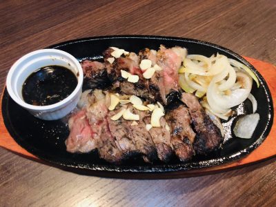 新メニュー「沖縄ステーキ」は、脂身の少ない美味しいお肉を特製のタレに付けて楽しめるという大人気商品とのこと。