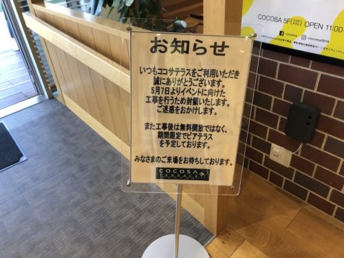 オープンに伴い、5月7日からココサテラスは封鎖されているのでご注意ください!