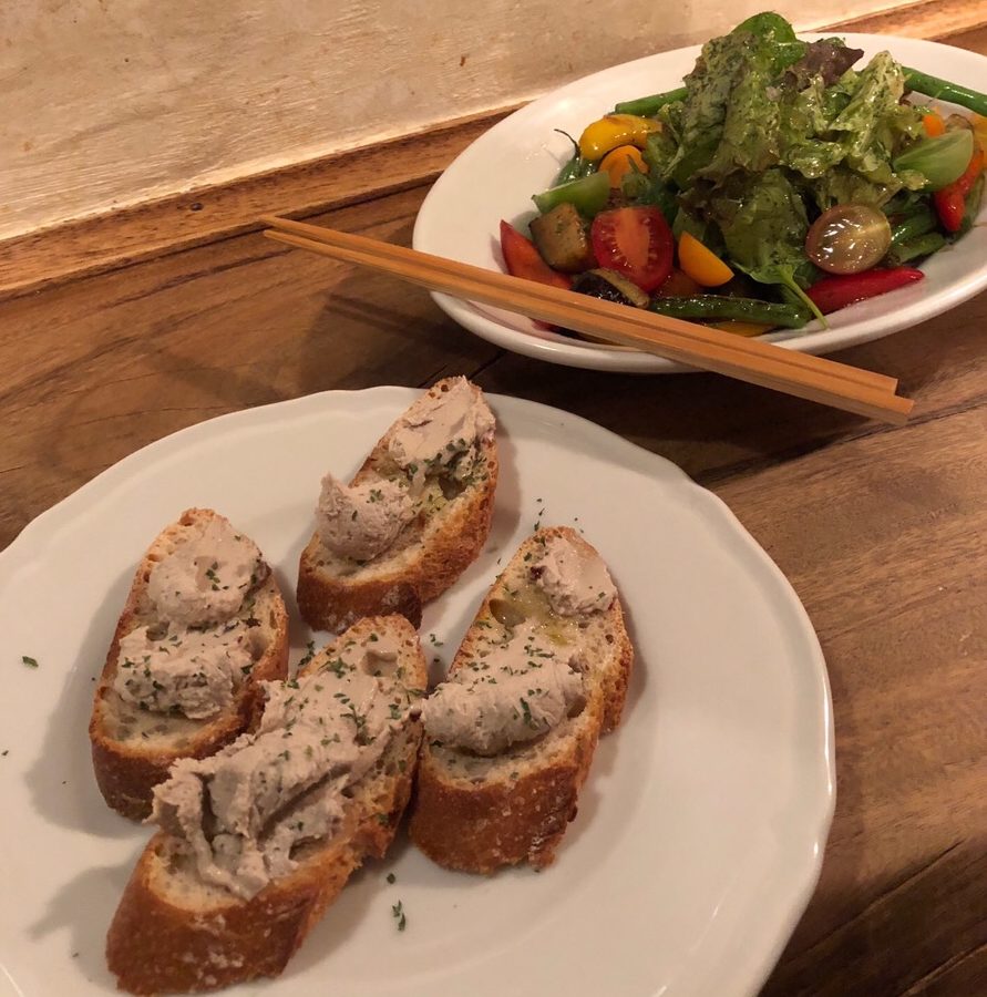 スモークベーコンは味が濃く、さっぱりとした野菜との相性が抜群!濃厚ないわしのリエットがたっぷり塗ってあり、「いわしってこんなにバケットと合うのですね!」と感動。