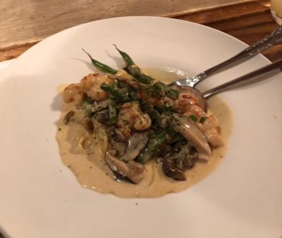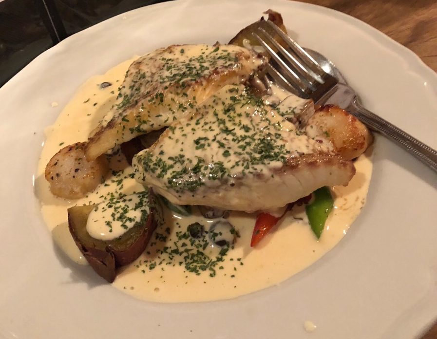 次に、「真鯛と貝柱のグリル白ワインソース 」。こんがりと焼けた大きな真鯛とぷりぷりの貝柱に白ワインソースが絡まり、口に運ぶのが止まりません。