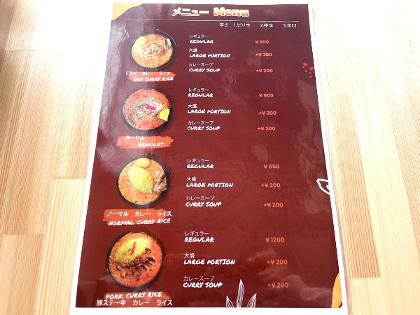 辛さは3種類から選べます。辛さが苦手な方は、スタッフさんにお伝えすると辛さを押さえた“ピリ辛”に変更することも可能です。