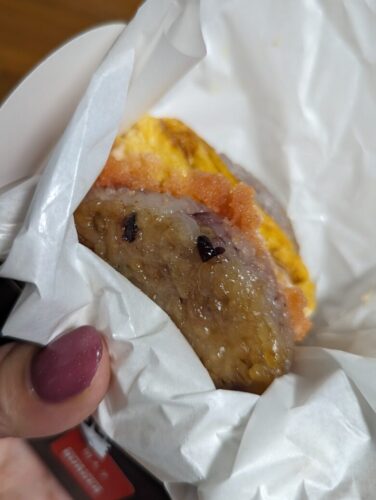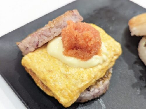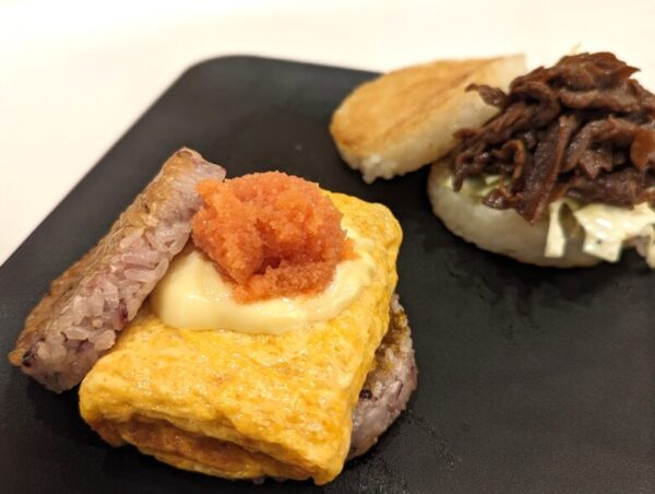 ライスバンズからはみ出るだし巻き卵と明太子。