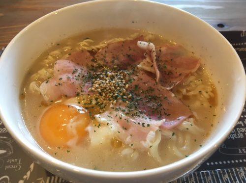 半熟のとろとろ卵に、ベーコンがたっぷり!さらに、ごま油も足してあるそうで、インスタントラーメン豪華版!