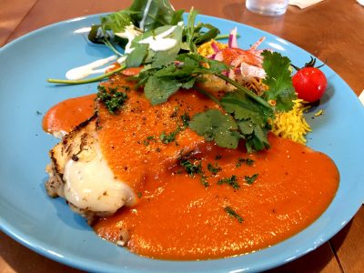 月替りのランチで、写真はエンチラーダーという料理になります。このソースも魚も絶品でした。