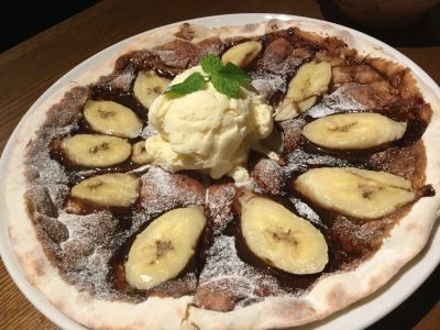 ピザ生地にチョコを伸ばして、スライスしたバナナを乗せて焼き上げ、最後にアイスをトッピング。