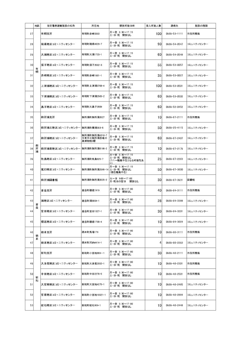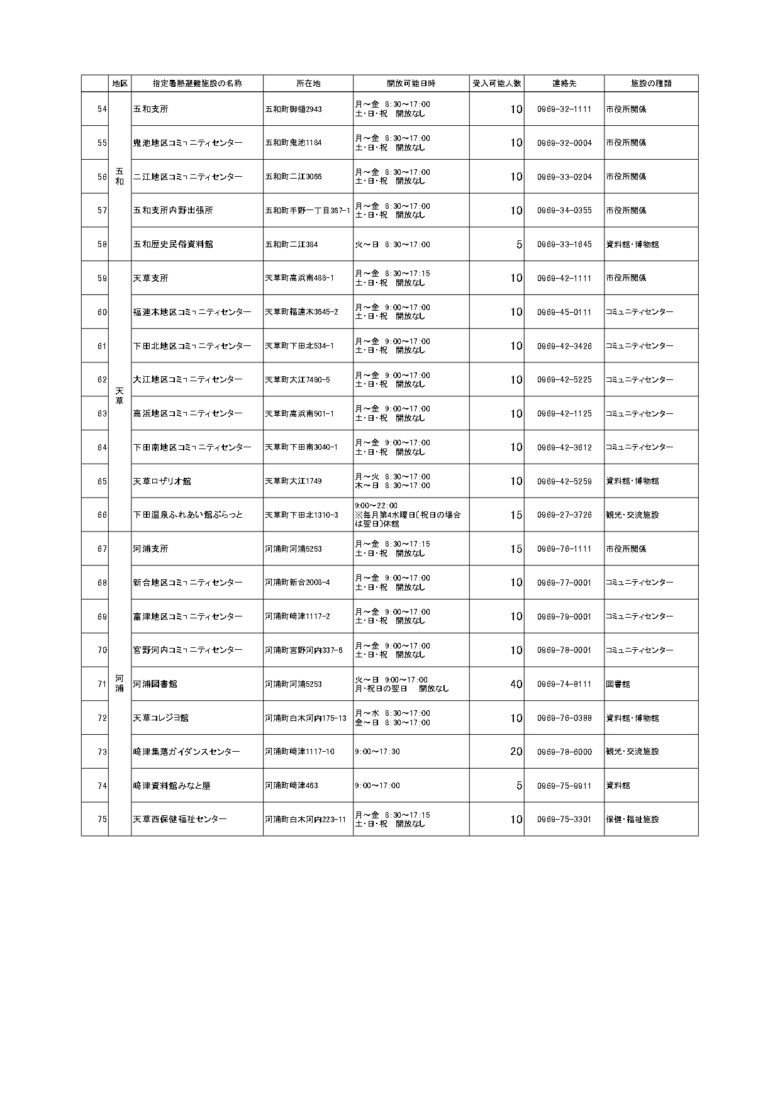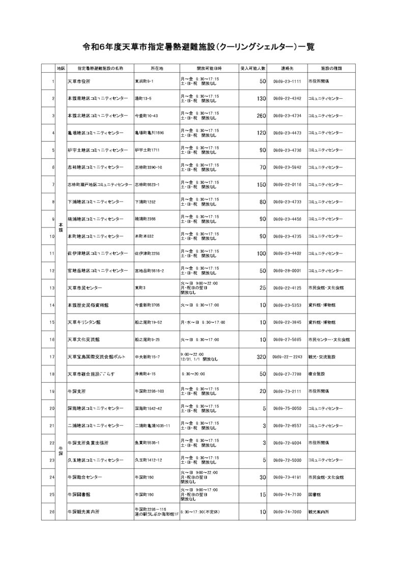 天草市でクーリングシェルターに指定されている場所は以下のとおりです。
