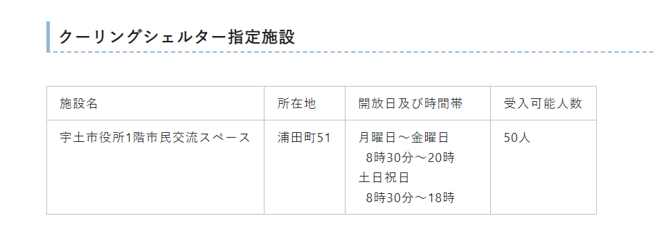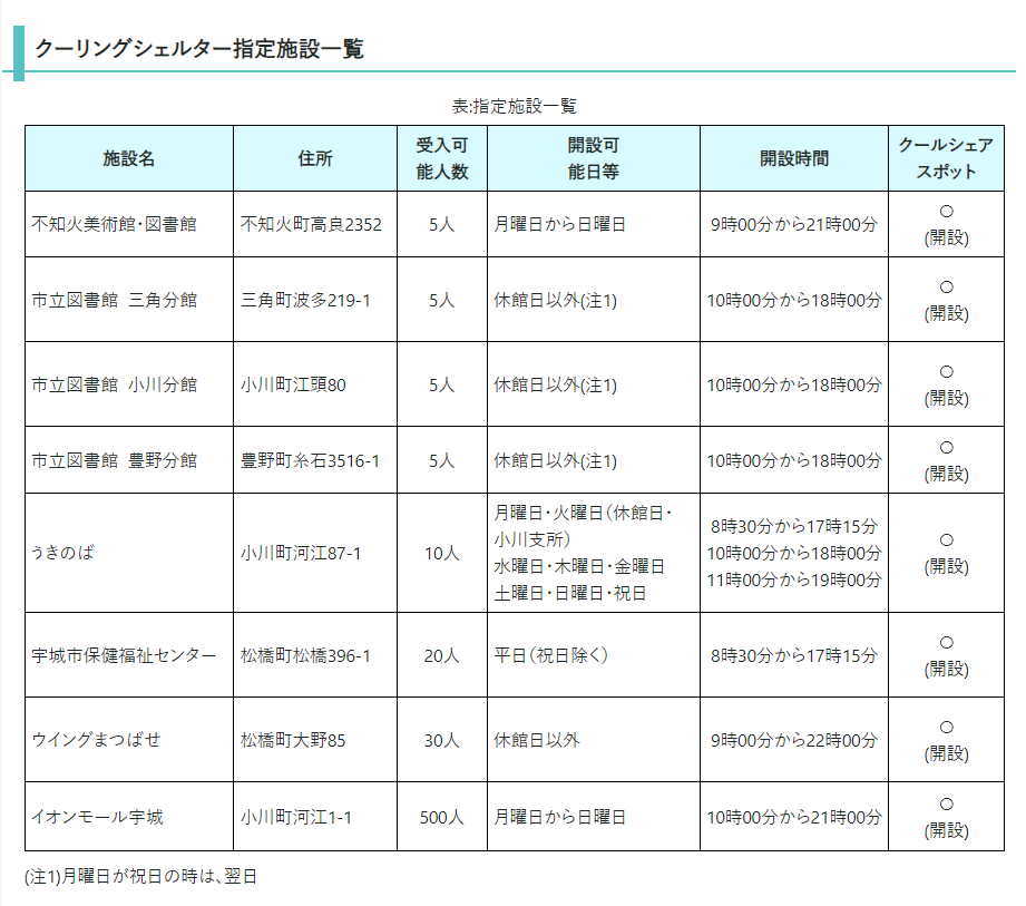 宇城市でクーリングシェルターに指定されている場所は以下のとおりです。