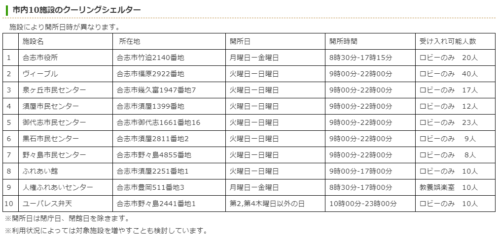 合志市でクーリングシェルターに指定されている場所は以下のとおりです。