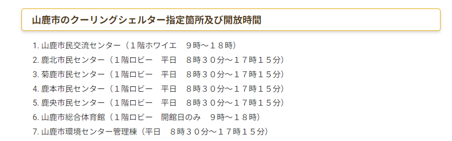 山鹿市でクーリングシェルターに指定されている場所は以下のとおりです。