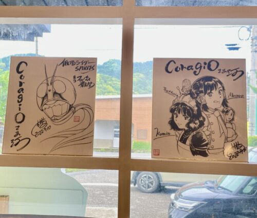 入り口には、芦北町を舞台にしたマンガ「放課後ていぼう日誌」のキャラクターの等身大パネルや、芦北町在住のマンガ家:村枝賢一先生がイラストを描いている「芦北伽哩街道」のノボリがあります。