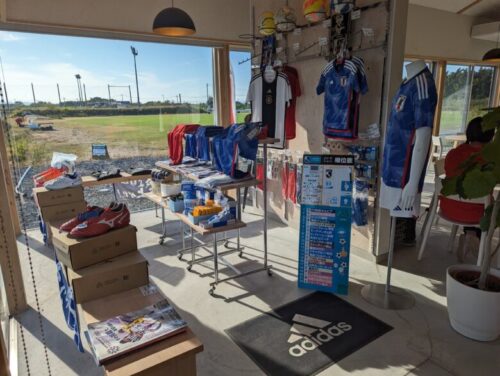 ドアを開けて入るとまず目につくサッカーのグッズにフットボールセンターの受付がありました。