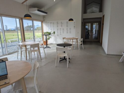 広い駐車場の奥にある建物の中にカフェはあります。