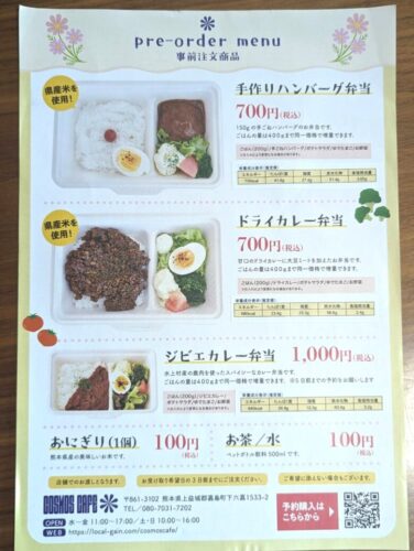 おすすめした大豆ミート使用のドライカレーの他、手作りのハンバーグ弁当に、水上村のシカ肉が使われているジビエカレーのお弁当の注文ができます。