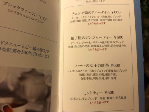アリスの登場人物にちなんだオリジナルブレンドの紅茶もいただくことができます!このカワイイ名前だけで注文したくなってしまいますね。