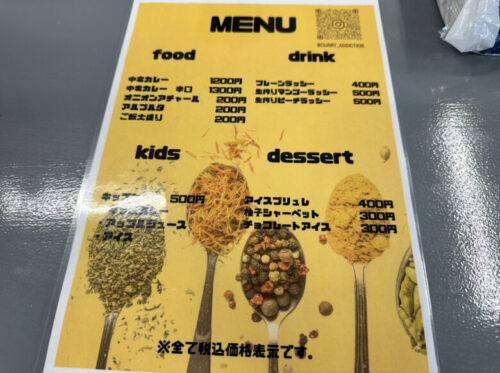 中毒カレー1,200円、中毒カレー辛口1,300円、オニオンアチャール200円、アルブルタ200円、ご飯大盛200円