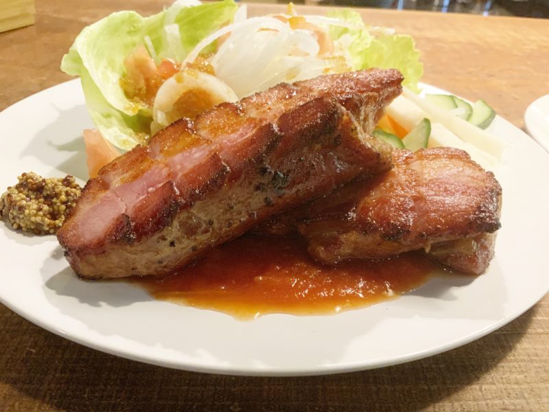 大きなベーコンブロックが2等分されやってきました、厚切りベーコンランチ。