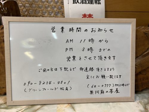 残念ながら、こちらの奥阿蘇の茶屋さんは年内で閉店するそうです。25日か26日まで。