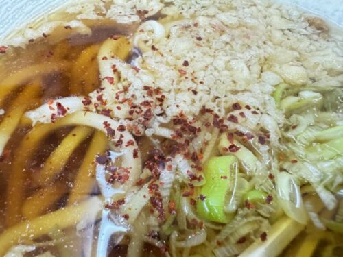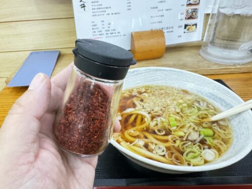 そこへ、机に備え付けの一味をかけます。ここの一味は色が濃ゆい!
