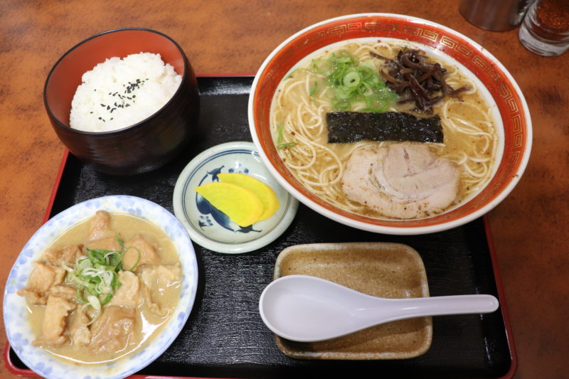 ラーメンにホルモン煮込み、ご飯とたくあんの4点セットになります。