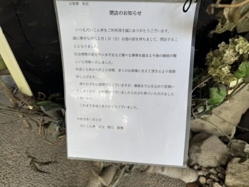 東区小山にある「だいこん亭」が、2026年2月1日、お昼の部をもって閉店されます。