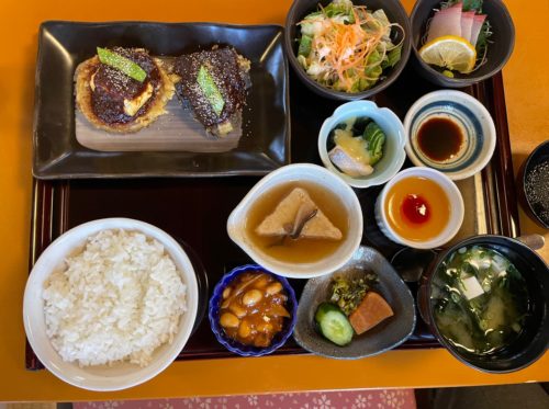さらに、お刺身やサラダ、大豆のトマト煮などの小鉢類に、ご飯と味噌汁、オレンジゼリーのデザートまでついた、豪華な御膳です。