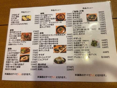 単品メニューもあるので、お好みのおつまみやおかずを頼んで、お酒を楽しむこともできます。