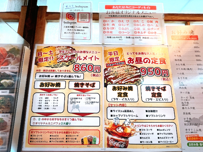 平日の11時~14時はお得なお昼の定食があるので、がっつり食べたい方はこちらが良いかも。