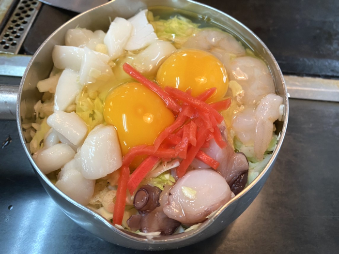 ムトーはCミックス(いか・えび・たこ・貝柱)990円を頂きました。卵が2個入っていて贅沢ですね。