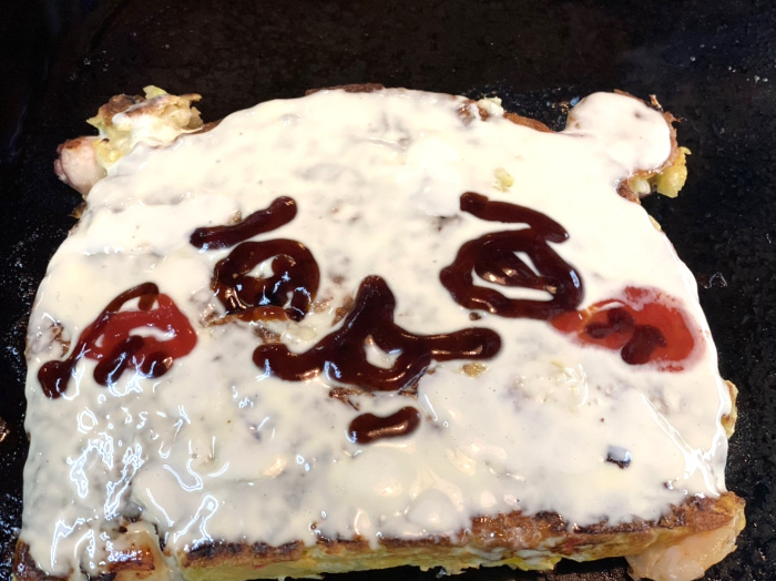ある程度焼いたら、ソースとマヨネーズを使って顔を仕上げます。